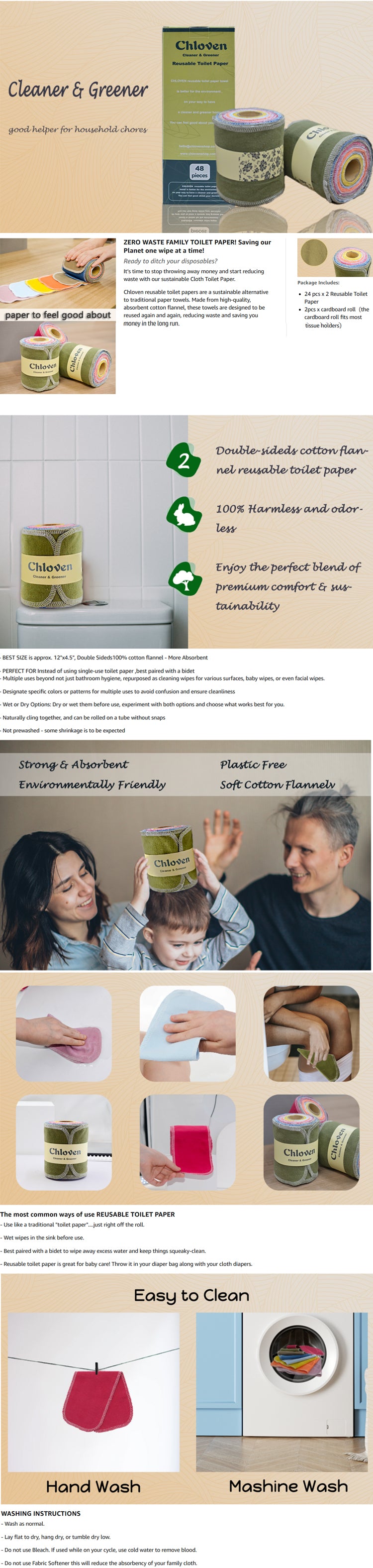 Chloven 48-Pack Reusable Cloth Toilet Paper – Washable, Absorbent & Soft Bidet Wipes with Durable Roll | Sustainable Zero-Waste Living