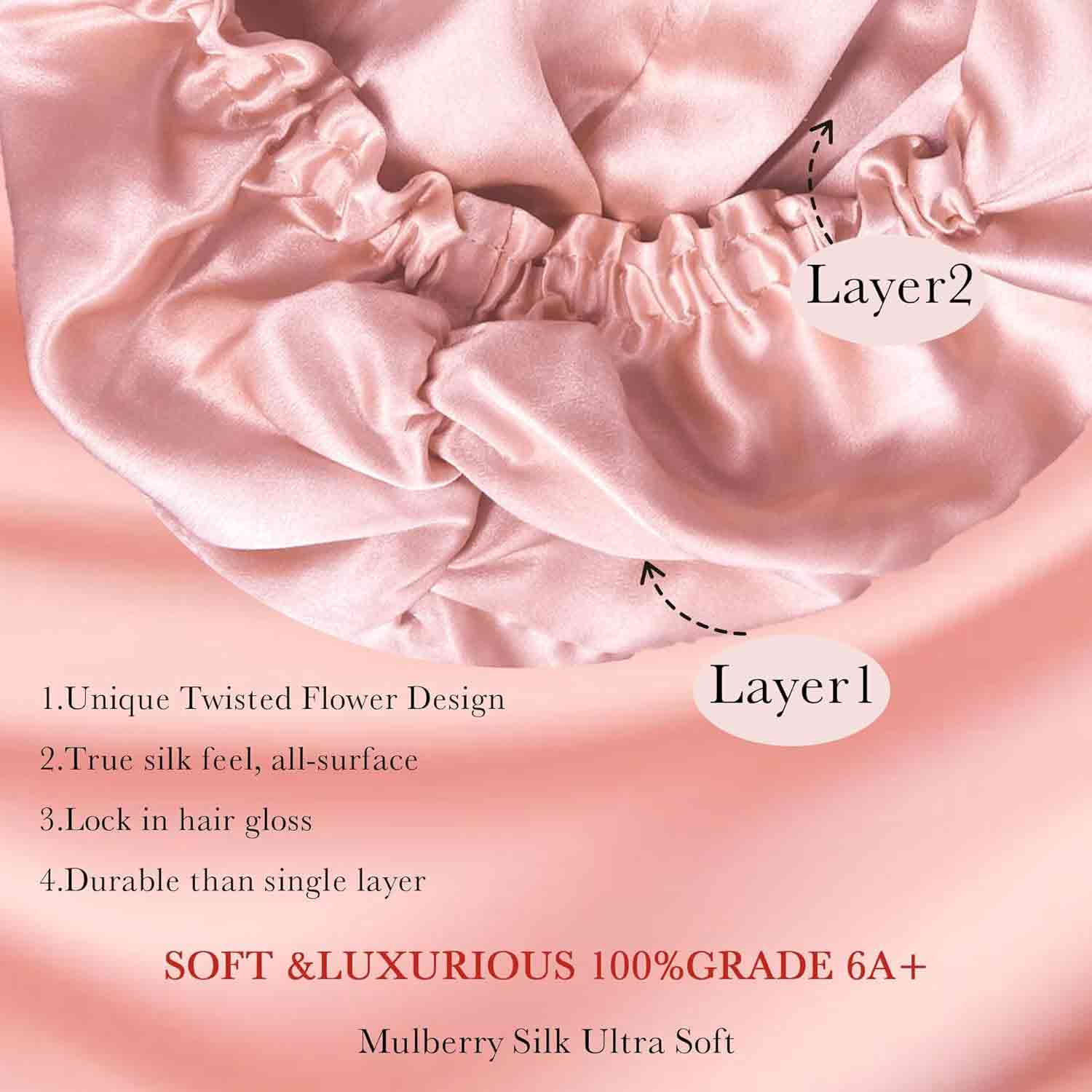 - Premium Double-Layered Mulberry Silk:Crafted with Grade 6A 100% mulberry silk on both sides, this luxury silk bonnet offers superior breathability, gloss, and durability. Thicker than standard silk, it provides unmatched friction reduction for fragile hair and sensitive skin